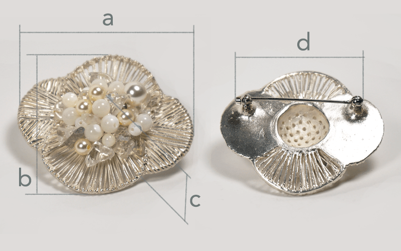 繊細な線を束ねて水晶やラブラドライトなどのビーズを縫い付けました。一本一本線を重ね、まるで生地や糸のように表現する細かい手作業はデザイナーが得意とする技法の一つ。透かしの加工が施され、着けた布の色と溶け合い、調和してくれるブローチです。